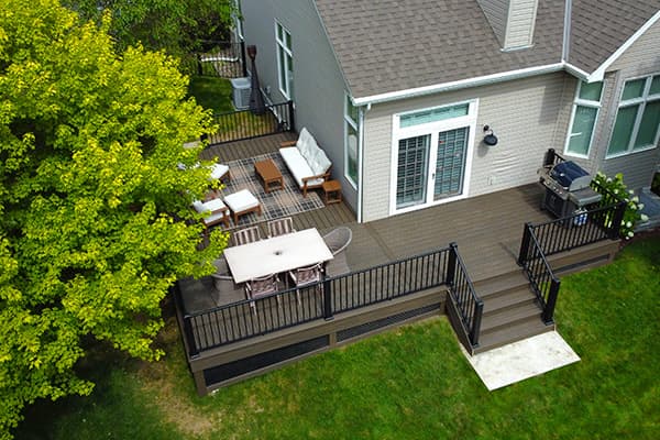 A spacious freestanding deck in Plymouth, Minnesota, redesigned on-site to overcome structural challenges and create the perfect gathering space for