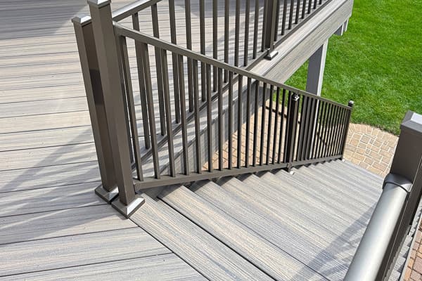 Complete stair and railing replacement using Trex composite boards and Westbury aluminum railings, finished with a reinforced concrete landing and