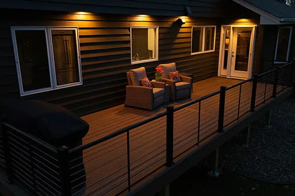A 10’ x 29’ composite deck in Eden Prairie built with Trex Toasted Sand and AFCO cable railings, featuring elegant
