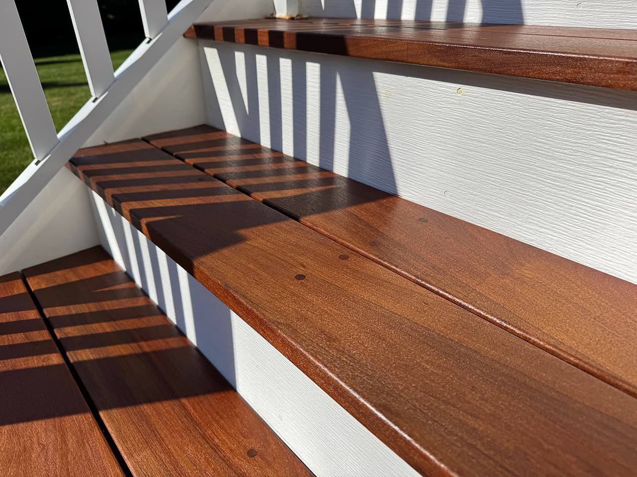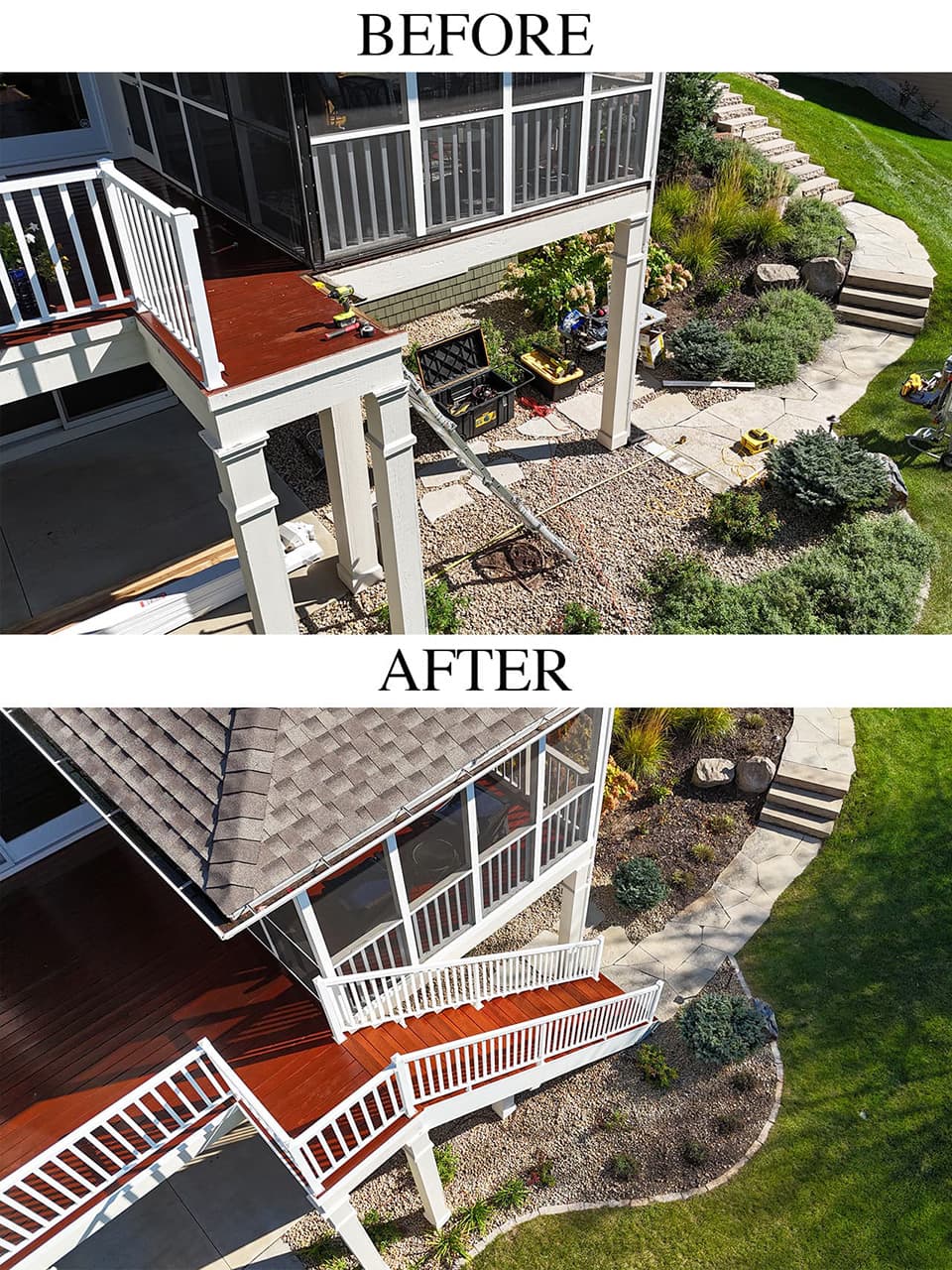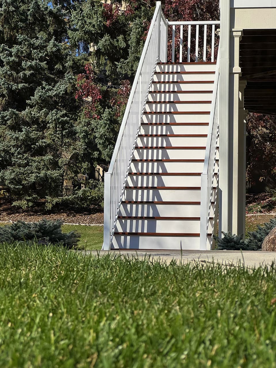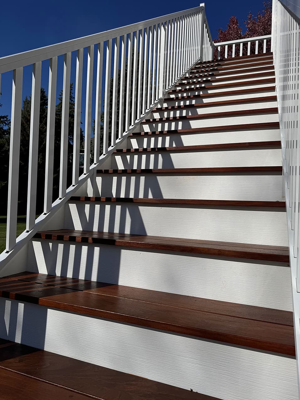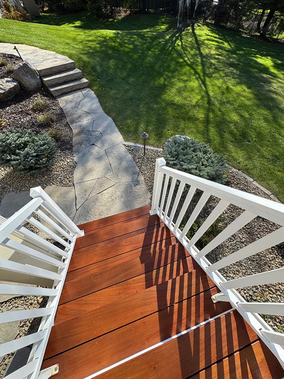 For this Eden Prairie project, I rebuilt an outdoor staircase using premium IPE (Brazilian Walnut) paired with durable PVC boards, creating a long-lasting structure with a clean, modern finish. The original aluminum railings were still in excellent condition, so instead of replacing them, I carefully preserved and reinstalled them into the new staircase. This kept the project cost-efficient while adding a sleek contrast to the rich IPE wood.