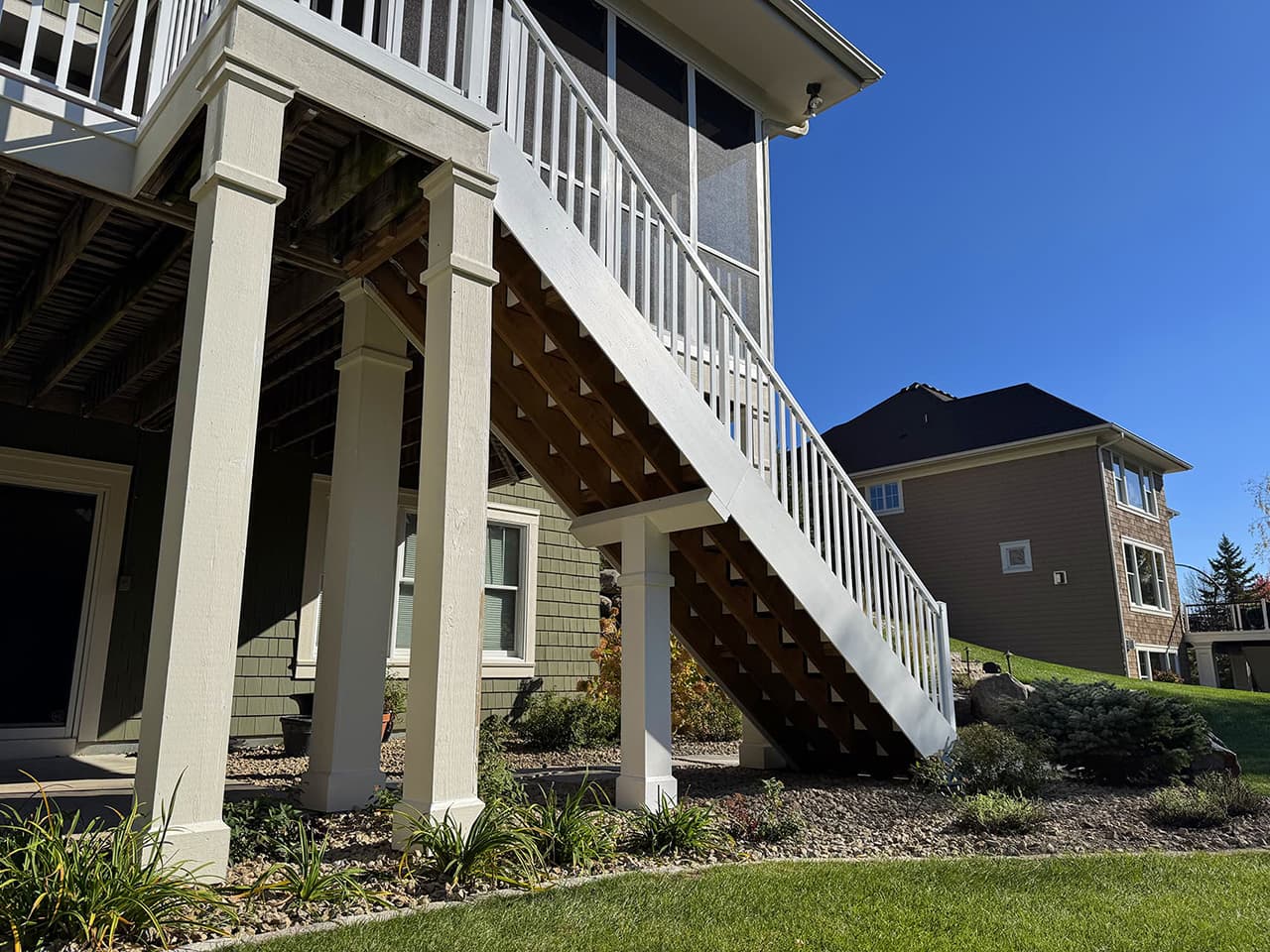 The new framework was constructed for proper strength and stability, ensuring the staircase meets modern standards and can withstand Minnesota’s climate. After installation, the IPE wood was finished with IPE oil, which brought out the deep, bright, natural color and enhanced the grain patterns beautifully.