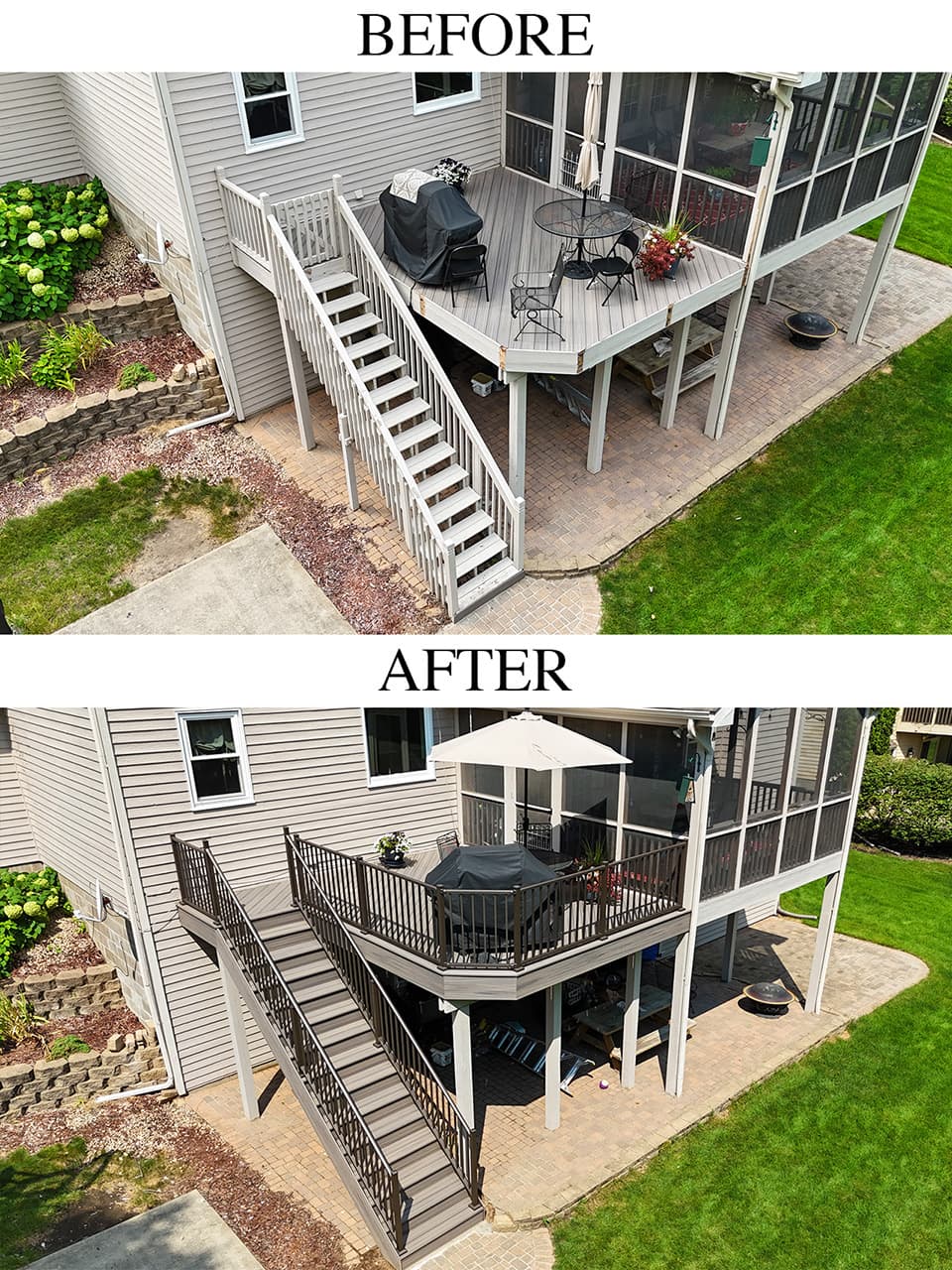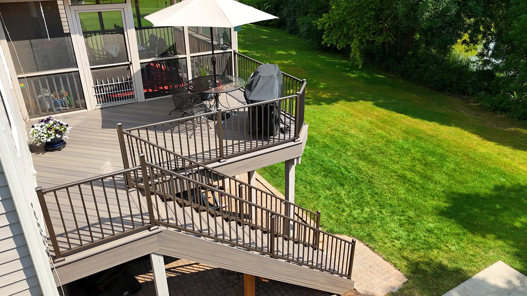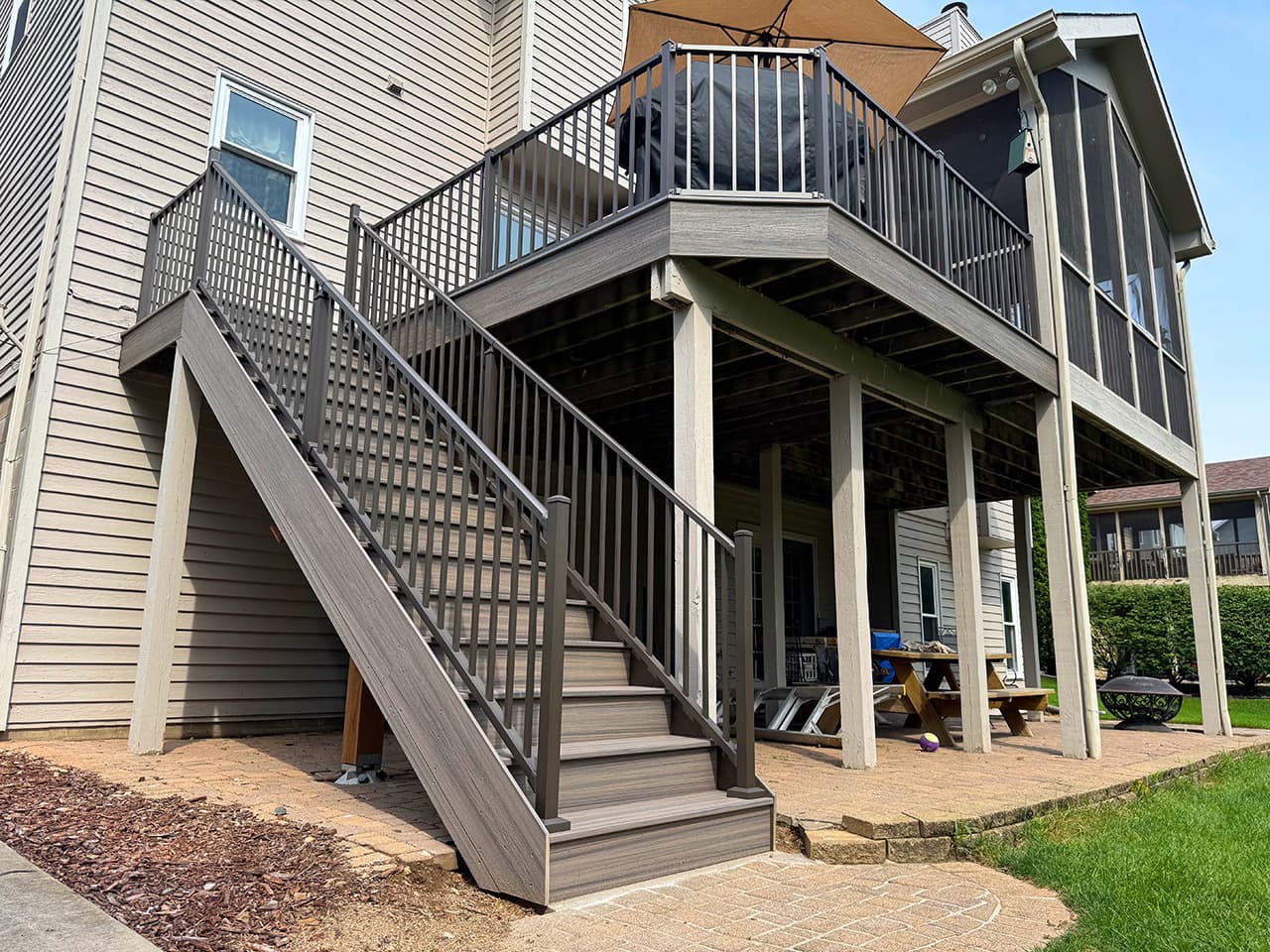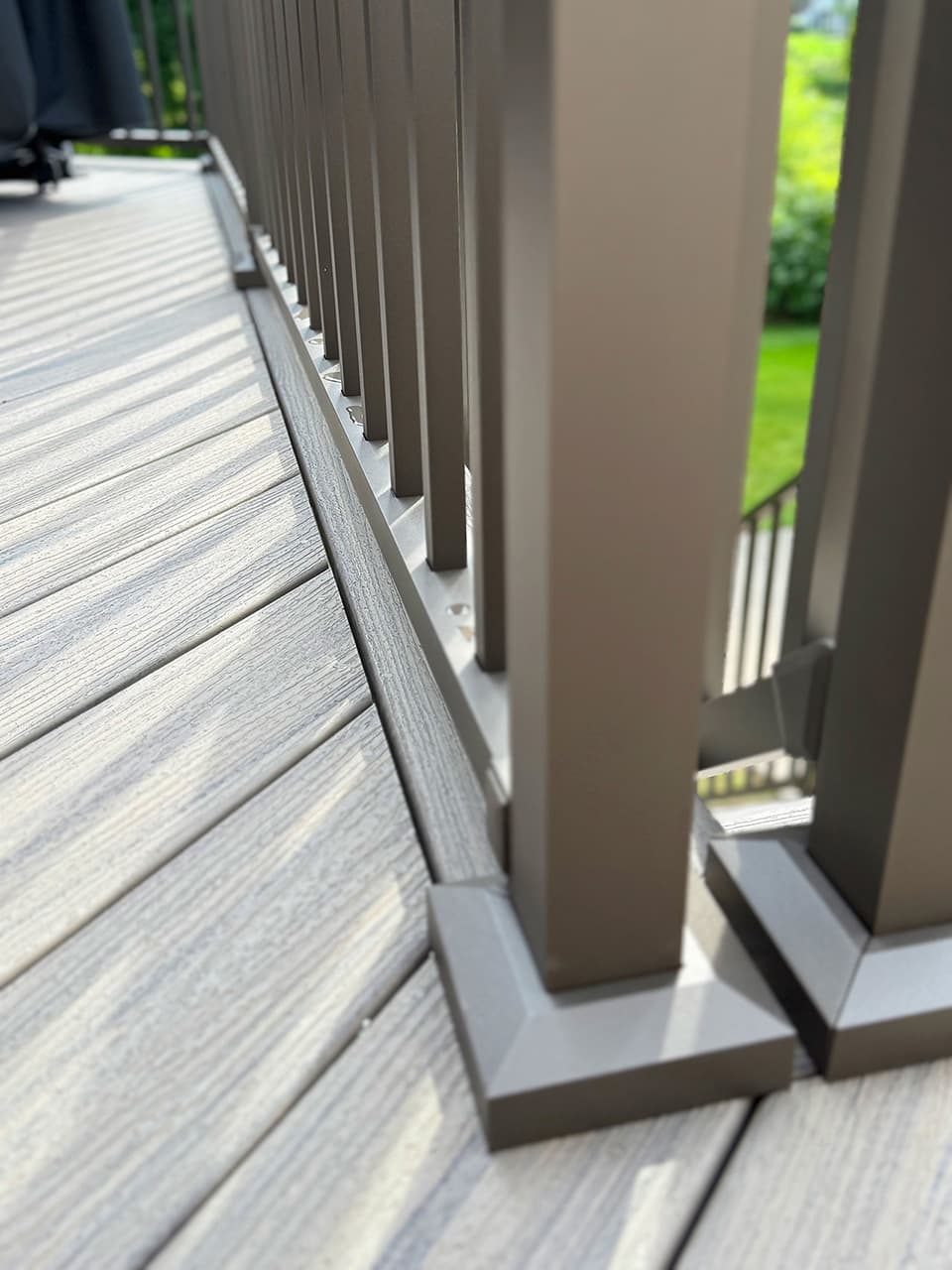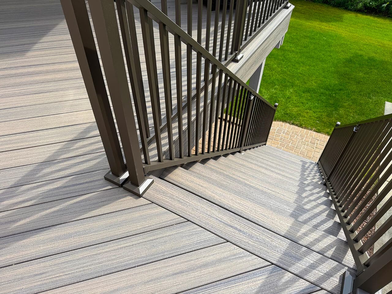 As part of this project, we fully dismantled the old staircase and built a brand-new, durable stair system. We used Trex Enhance “Rocky Harbor” composite boards for a clean, maintenance-free look, paired with Westbury aluminum railings in a textured bronze finish for a sleek, modern touch.