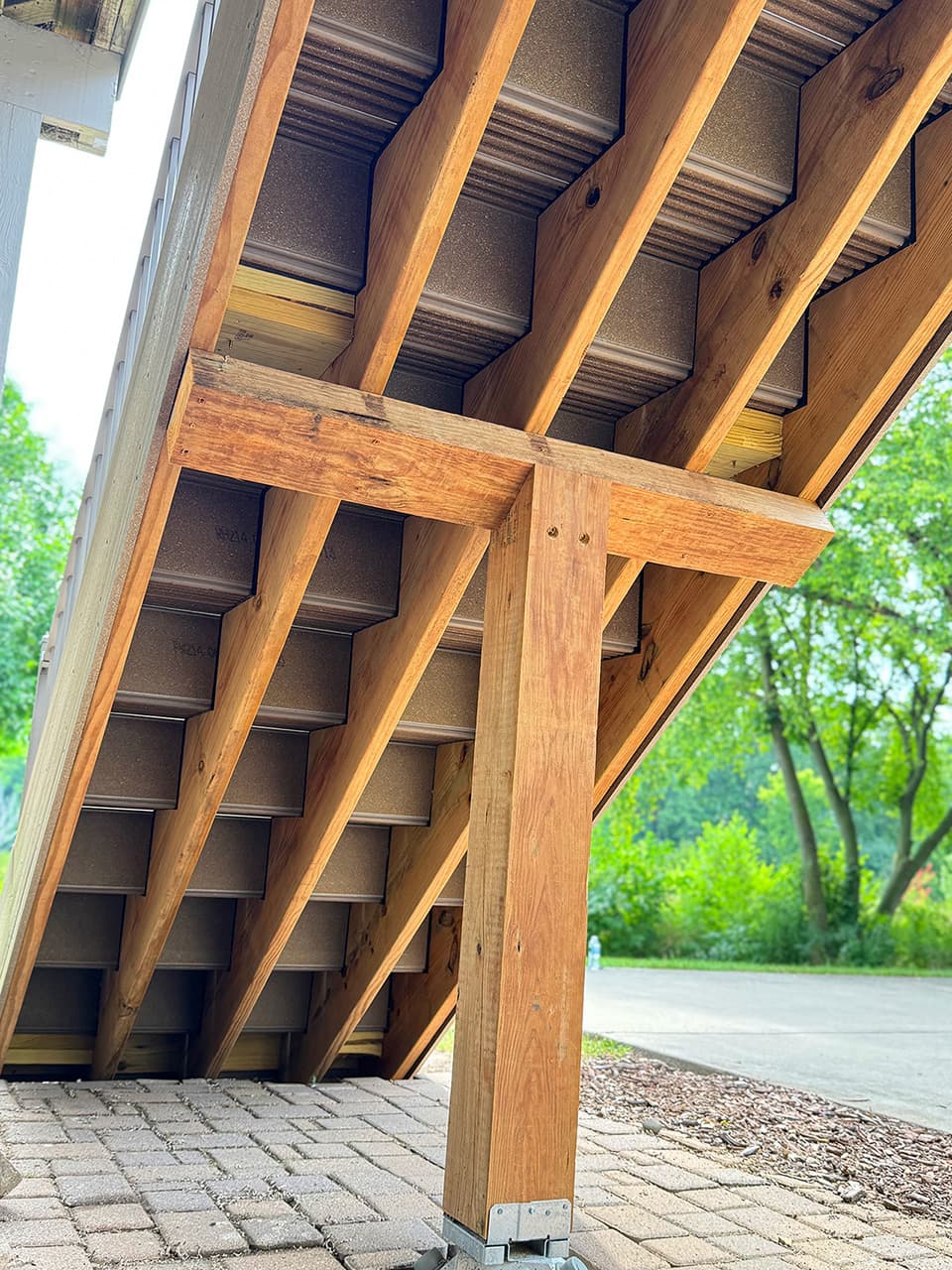 For stability and long-term durability, we poured a reinforced concrete landing pad with rebar and installed a T-shaped support post beneath the stairs to ensure they are strong and secure. The finished stair rise measured 7¾ inches, offering a safe and comfortable step height.