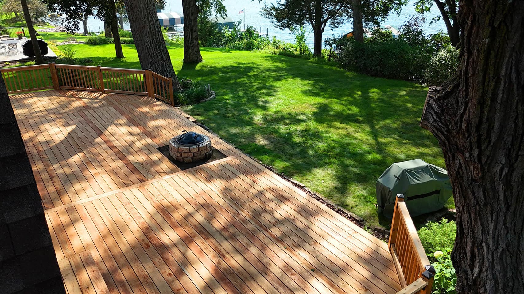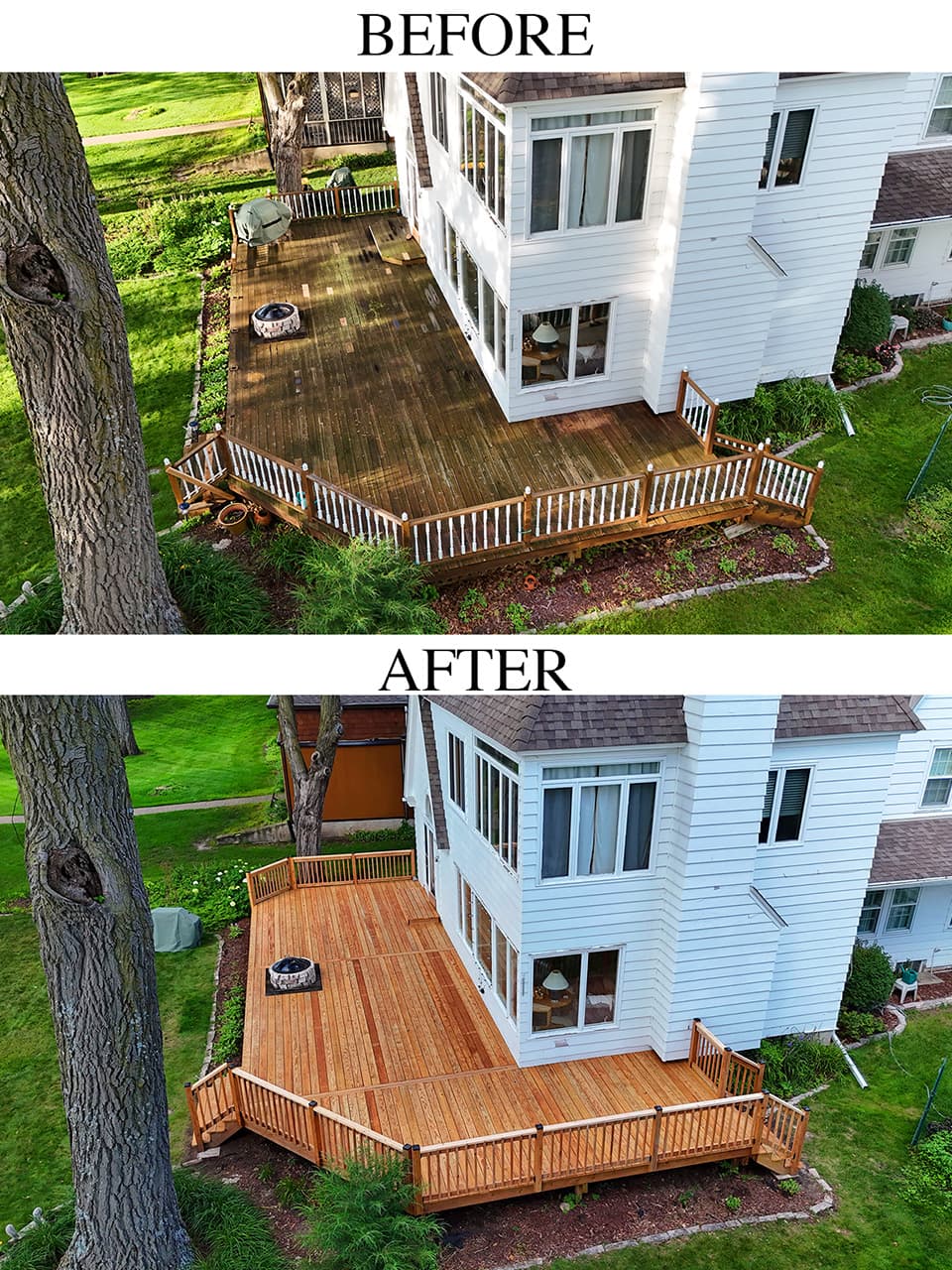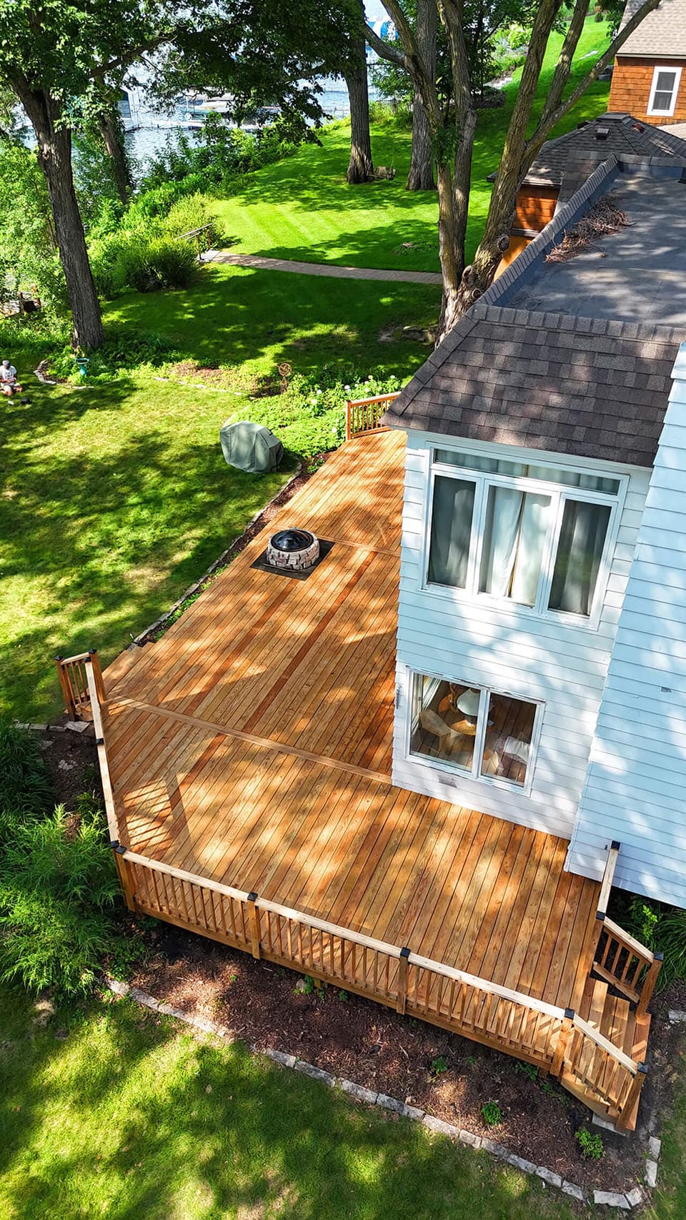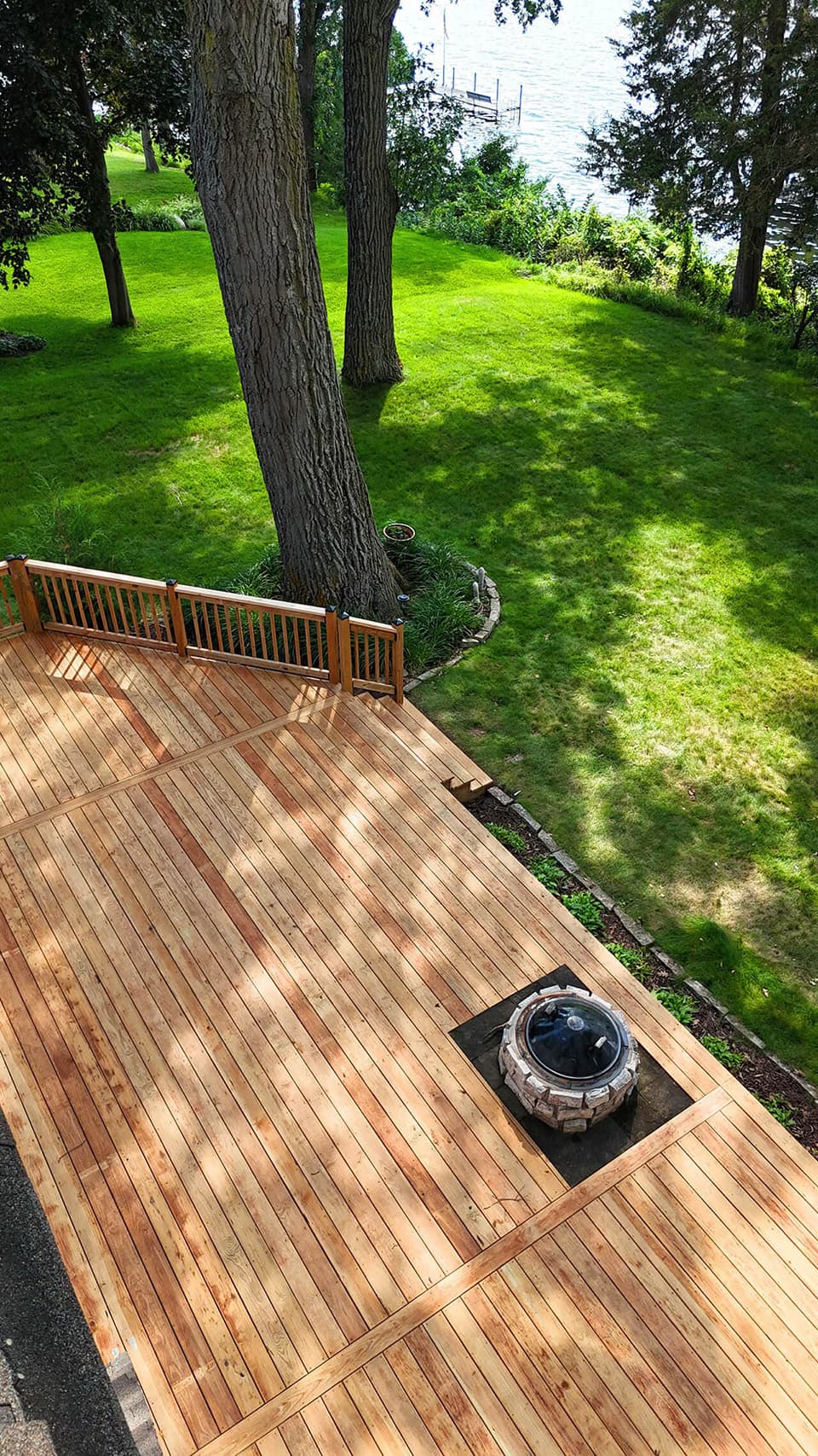 This project was completed in Tonka Bay, a serene lakeside town with beautiful views and peaceful surroundings. The original cedar deck, totaling over 1,100 square feet, had become severely weathered over time. We removed the deteriorated boards, replaced the rim board around the perimeter, and rebuilt two staircases that connected the low-elevation deck to the yard area.