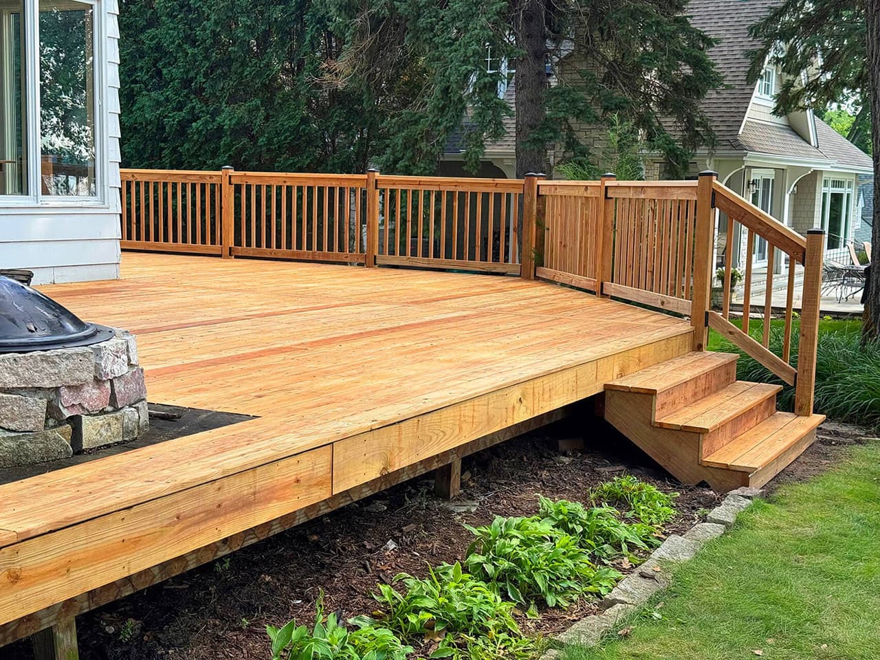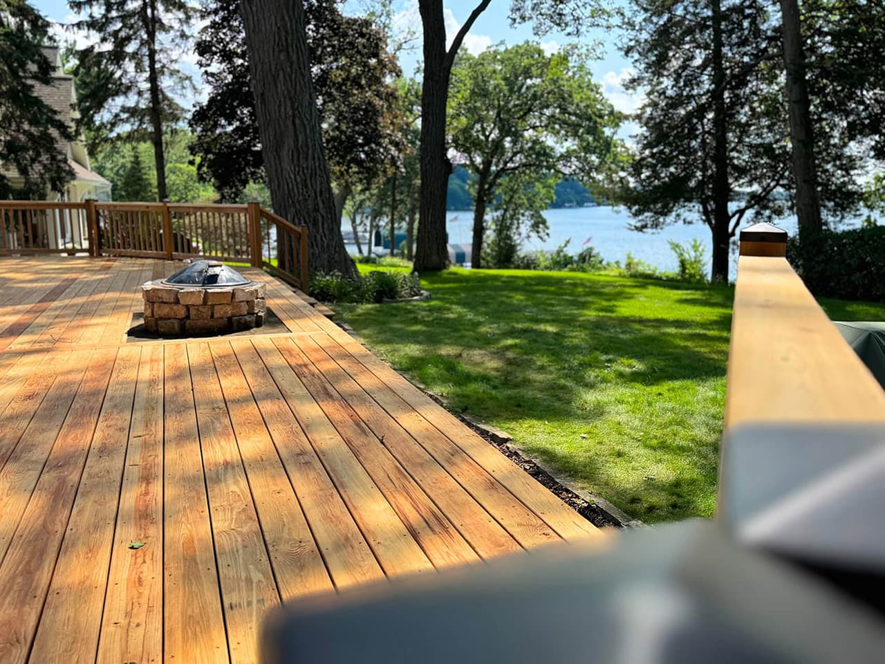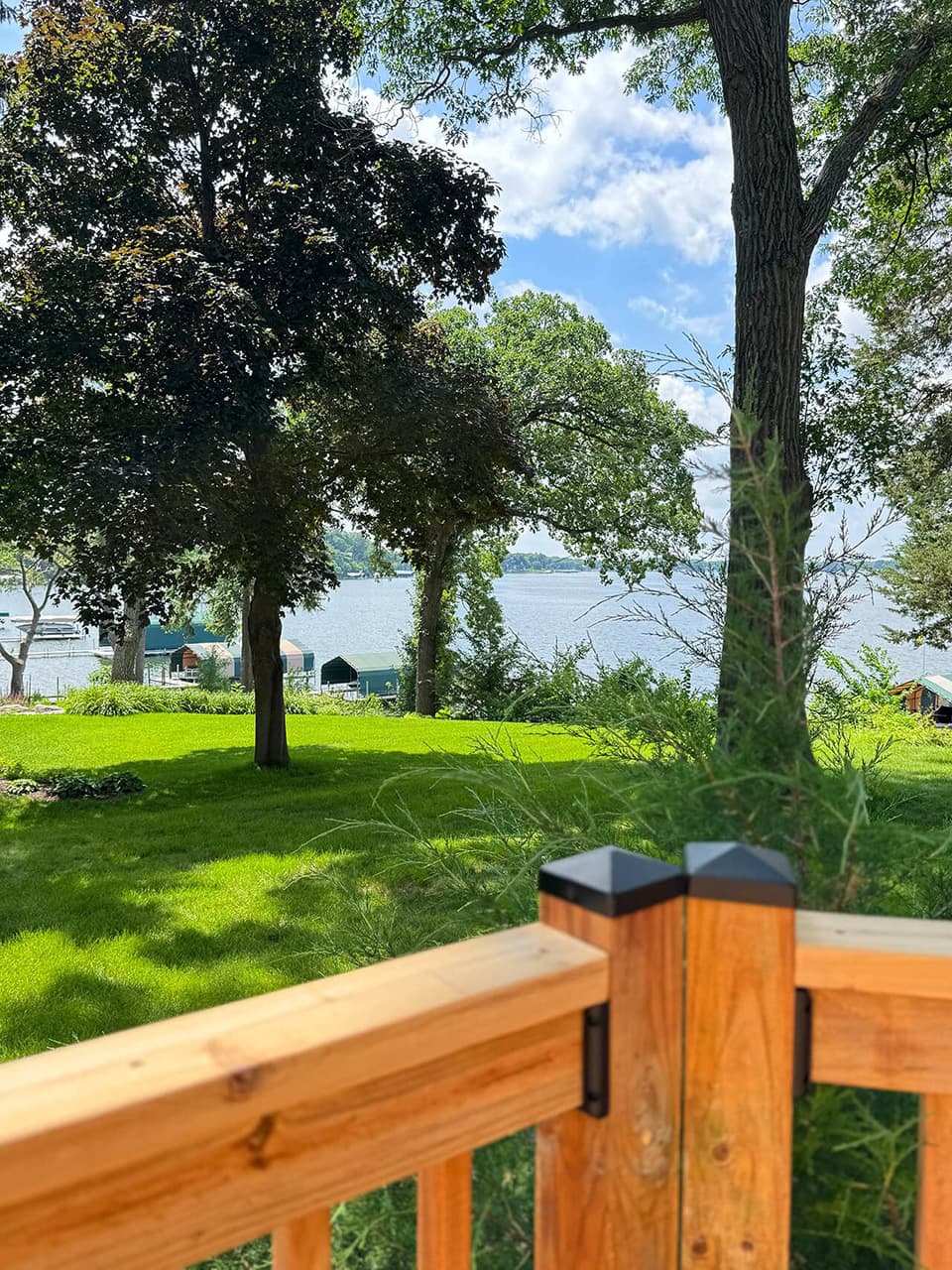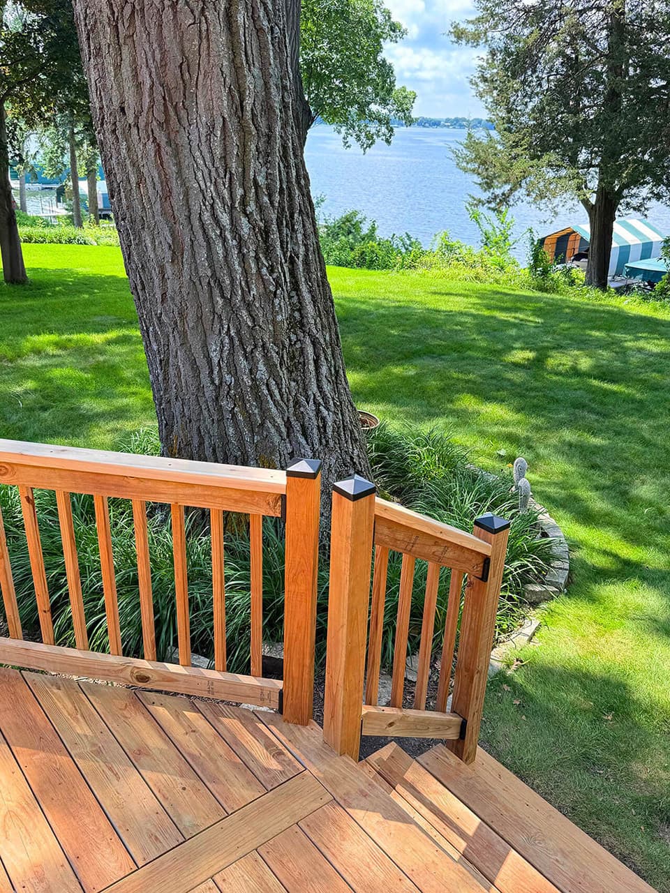 To ensure longevity and ease of maintenance, we installed pressure-treated decking and rail framing, while topping the railings with natural cedar boards to preserve a warm, natural aesthetic. The end result is a safe, refreshed, and inviting outdoor space that perfectly fits its lakeside setting.